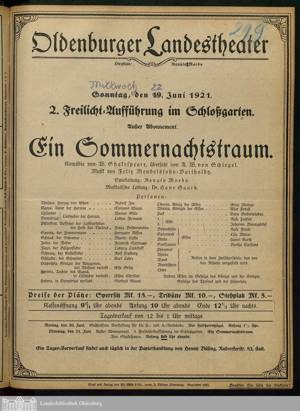 22.06.1921 - William Shakespeare / August Wilhelm Schlegel (Bearb.): Ein Sommern...