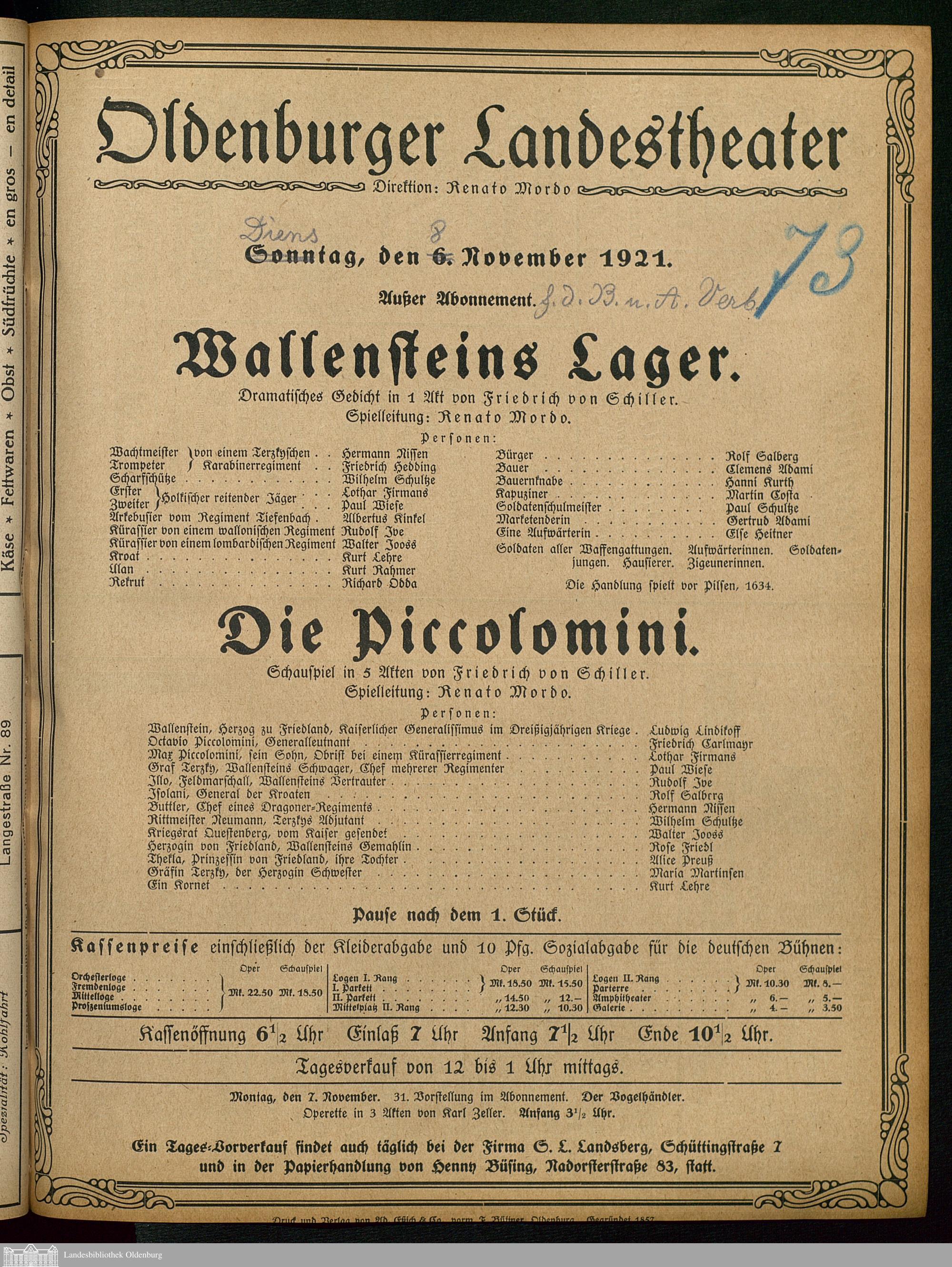08.11.1921 - Friedrich von Schiller: Wallensteins Lager; Friedrich von Schiller:...