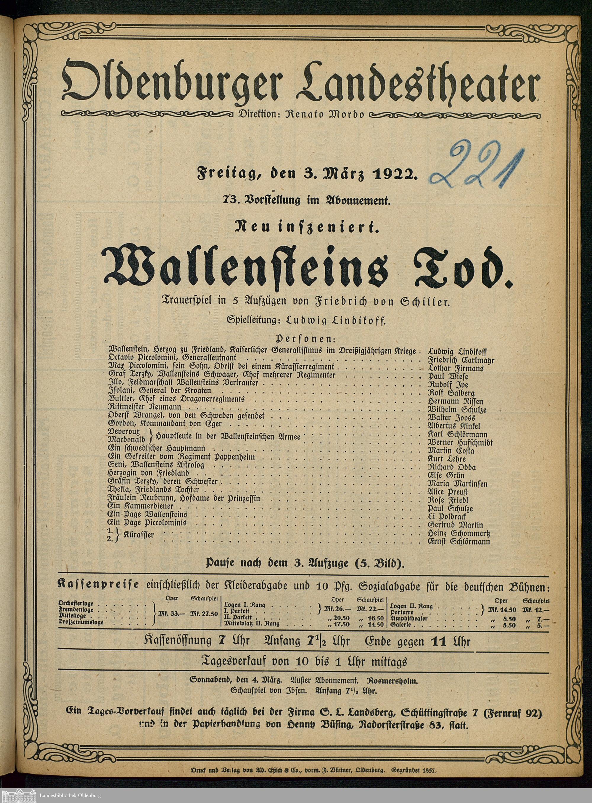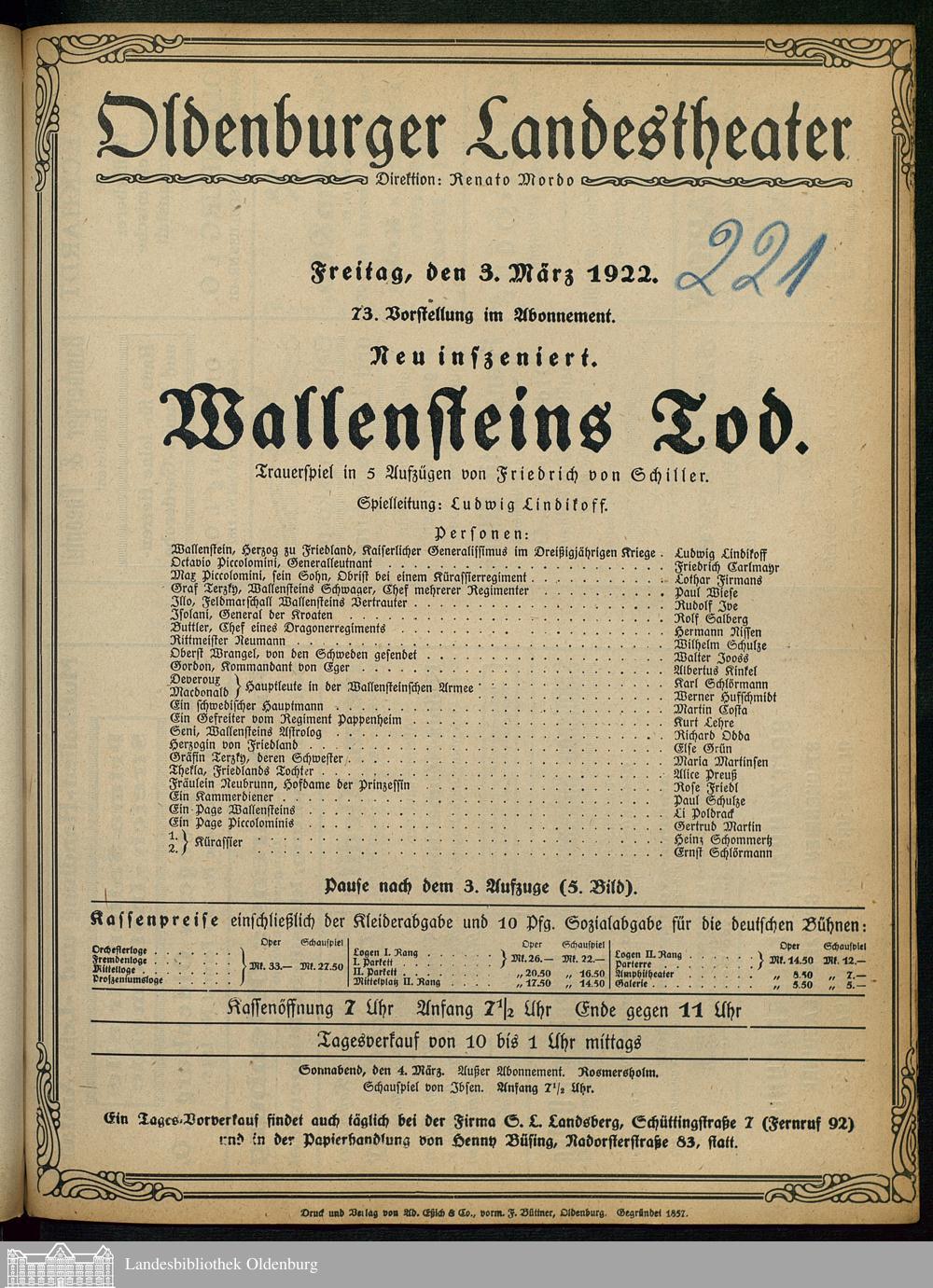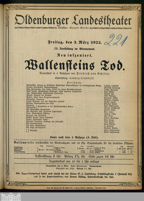 03.03.1922 - Friedrich von Schiller: Wallensteins Tod.