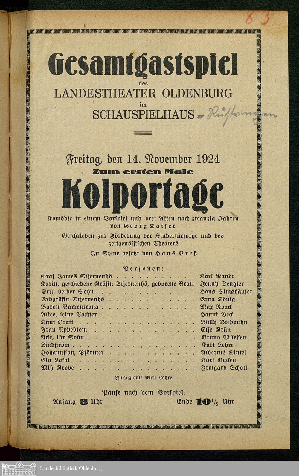 14.11.1924 - Georg Kaiser: Kolportage. [Gastspiel in Rüstringen]