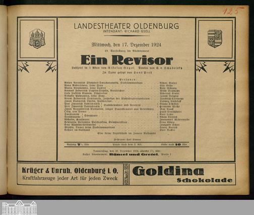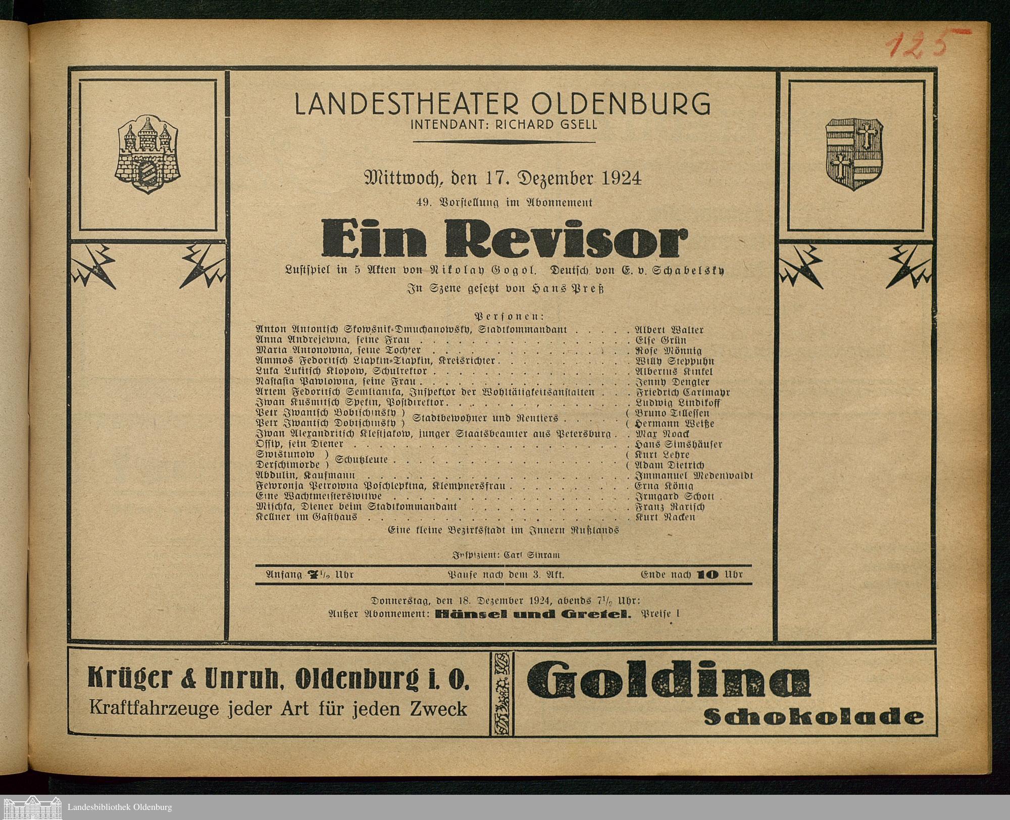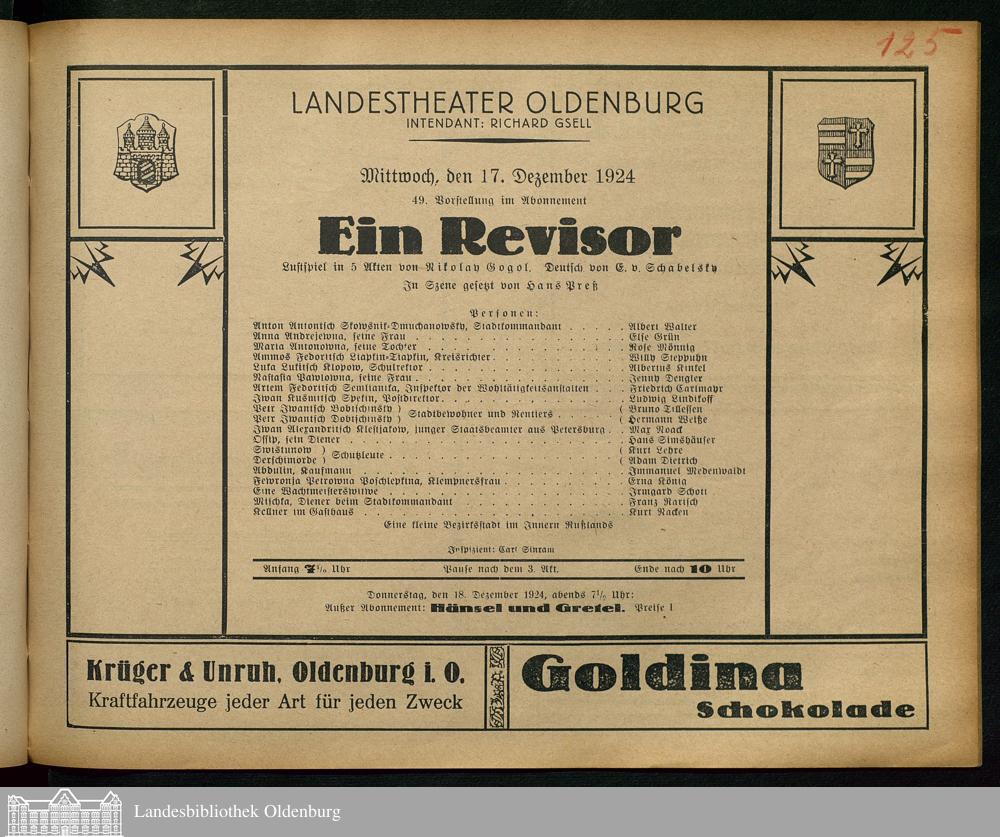 17.12.1924 - Nikolaj Vasil'evič Gogol' / Else von Schabelsky (Bearb.): Ein Revis...