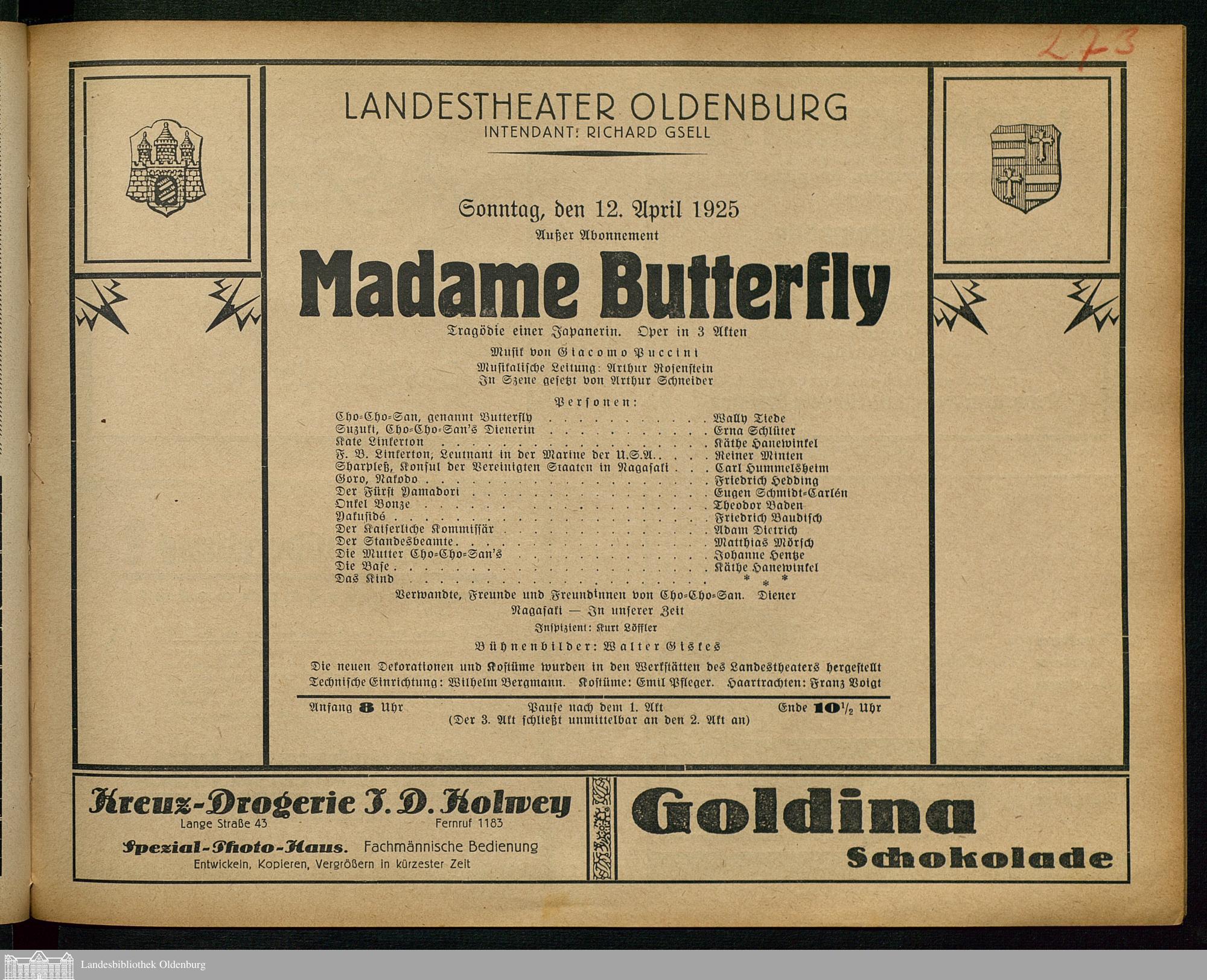 12.04.1925 - Giuseppe Giacosa / Luigi Illica (Bearb.): Madame Butterfly.