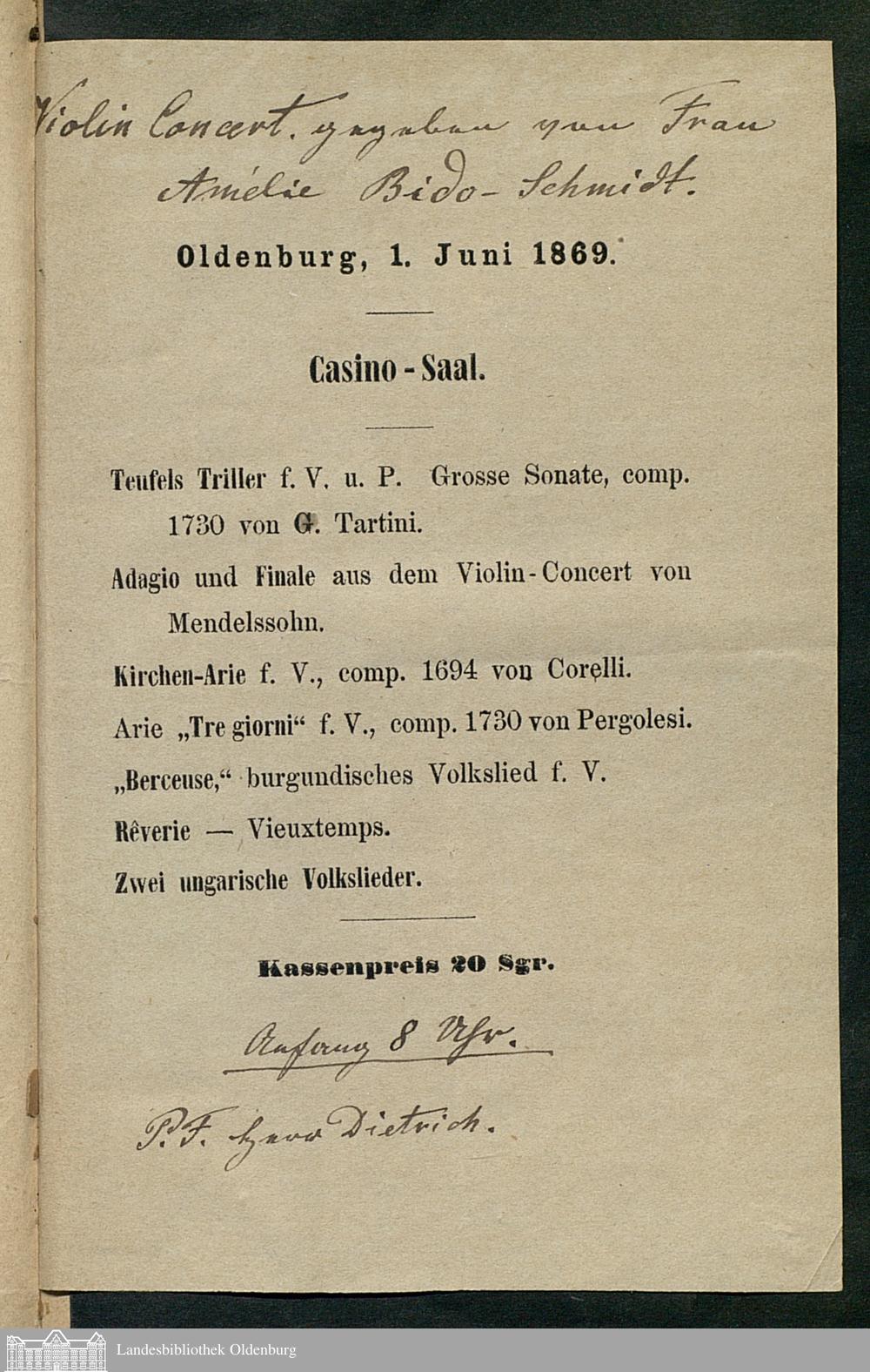 01.06.1869 - Violin Concert, mit Amélie Bido-Schmidt, Casino-Saal