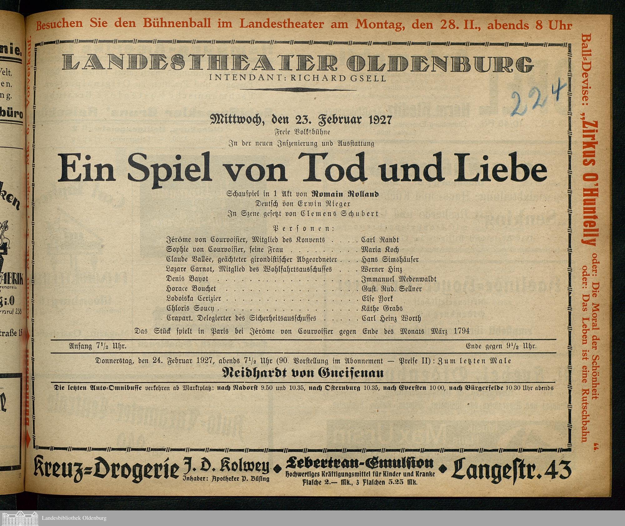 23.02.1927 - Romain Rolland: Ein Spiel von Tod und Liebe.