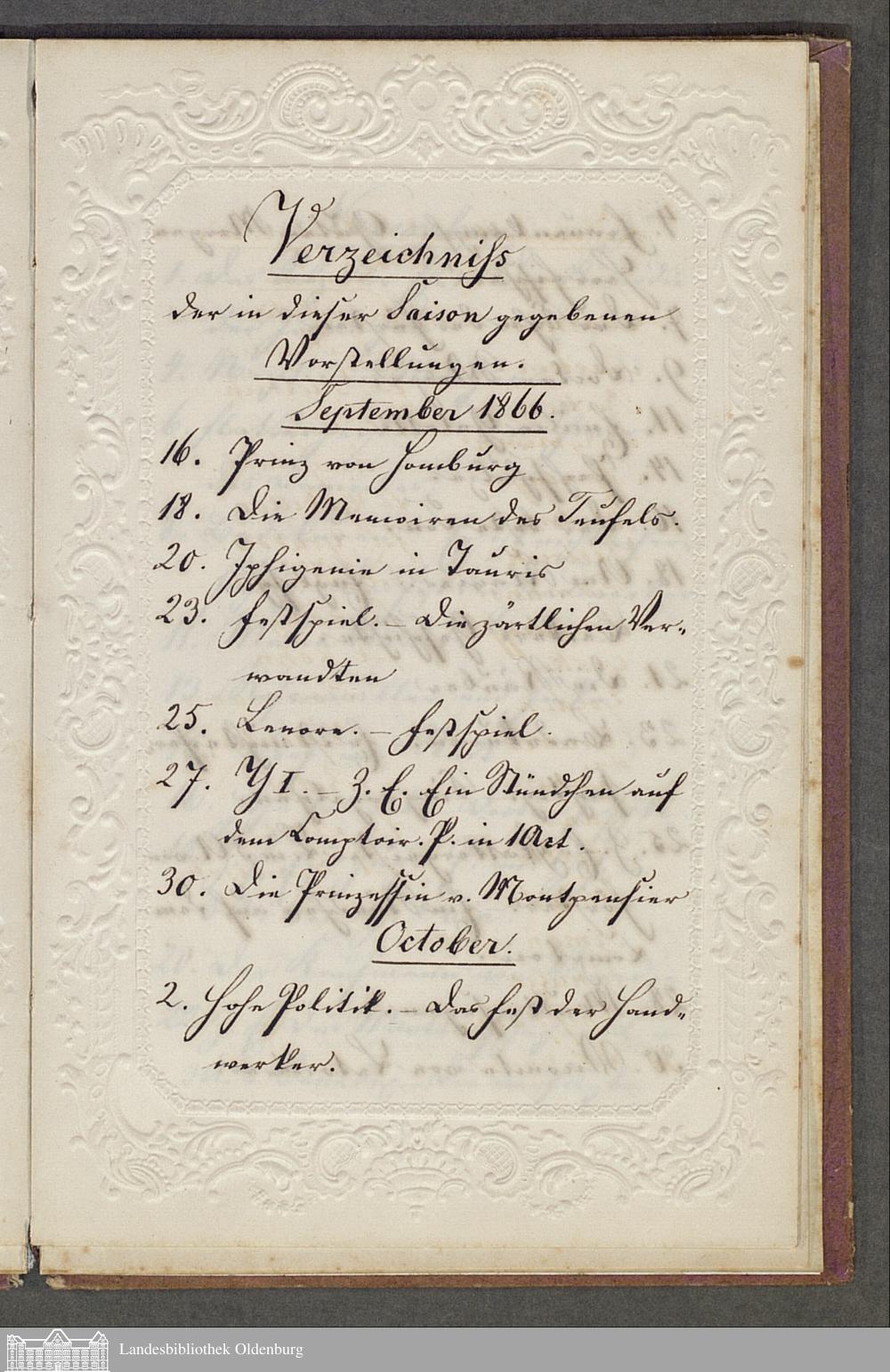 Journal des Stadt-Theaters in Oldenburg 1866-67.