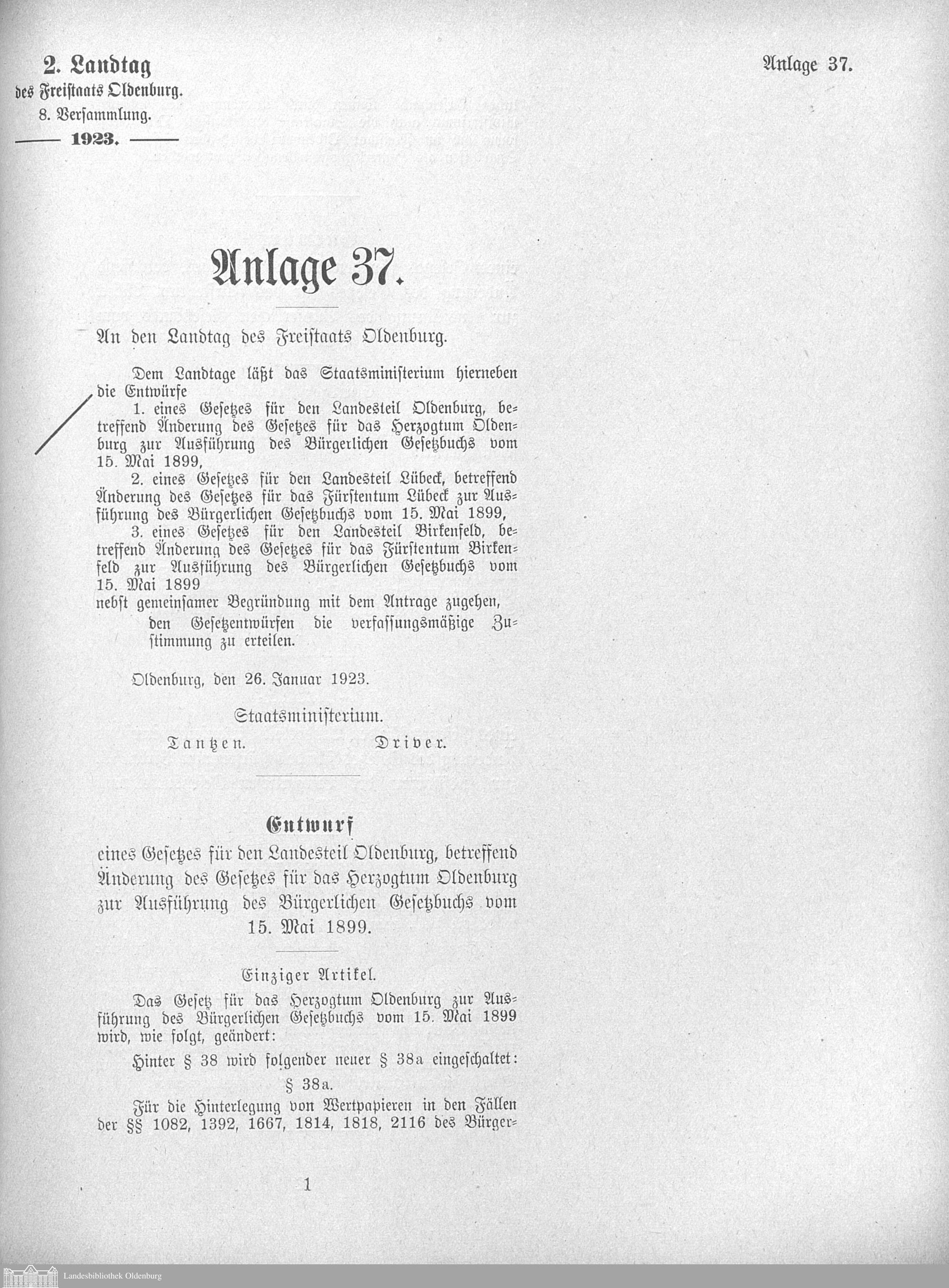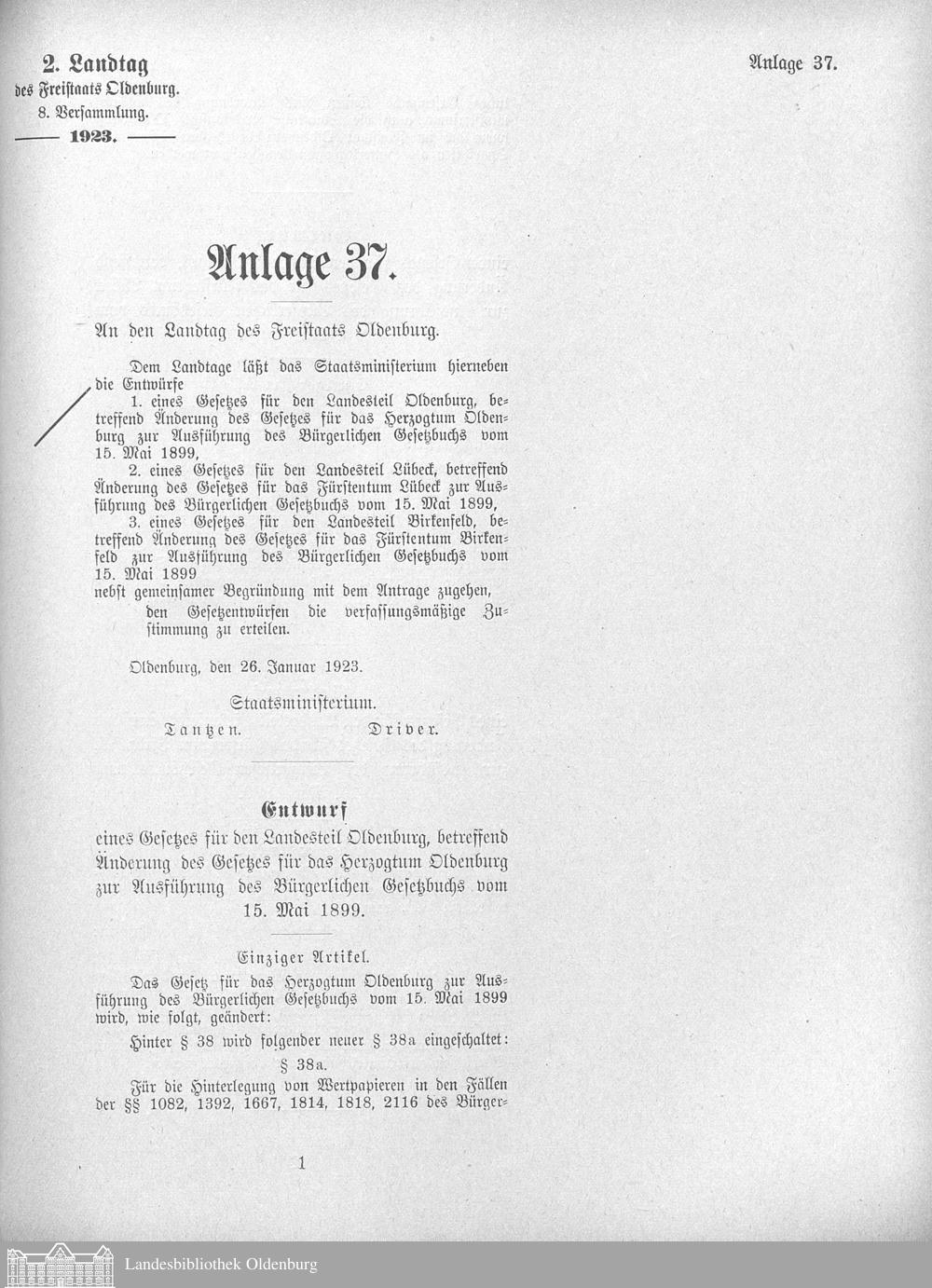 Verhandlungen der ... Versammlung des ... Landtags des Freistaats Oldenburg / Anlagen zu den Niederschriften und Berichten / Anlagen zu den Protokollen und Berichten