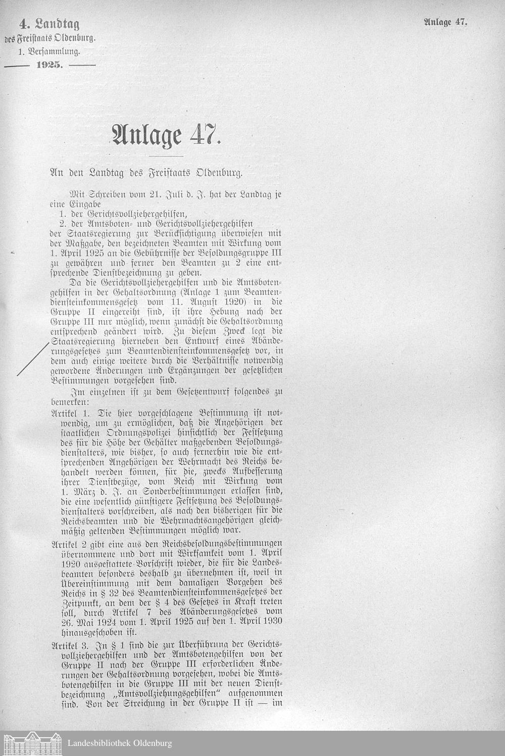 Verhandlungen der ... Versammlung des ... Landtags des Freistaats Oldenburg / Anlagen zu den Niederschriften und Berichten / Anlagen zu den Protokollen und Berichten