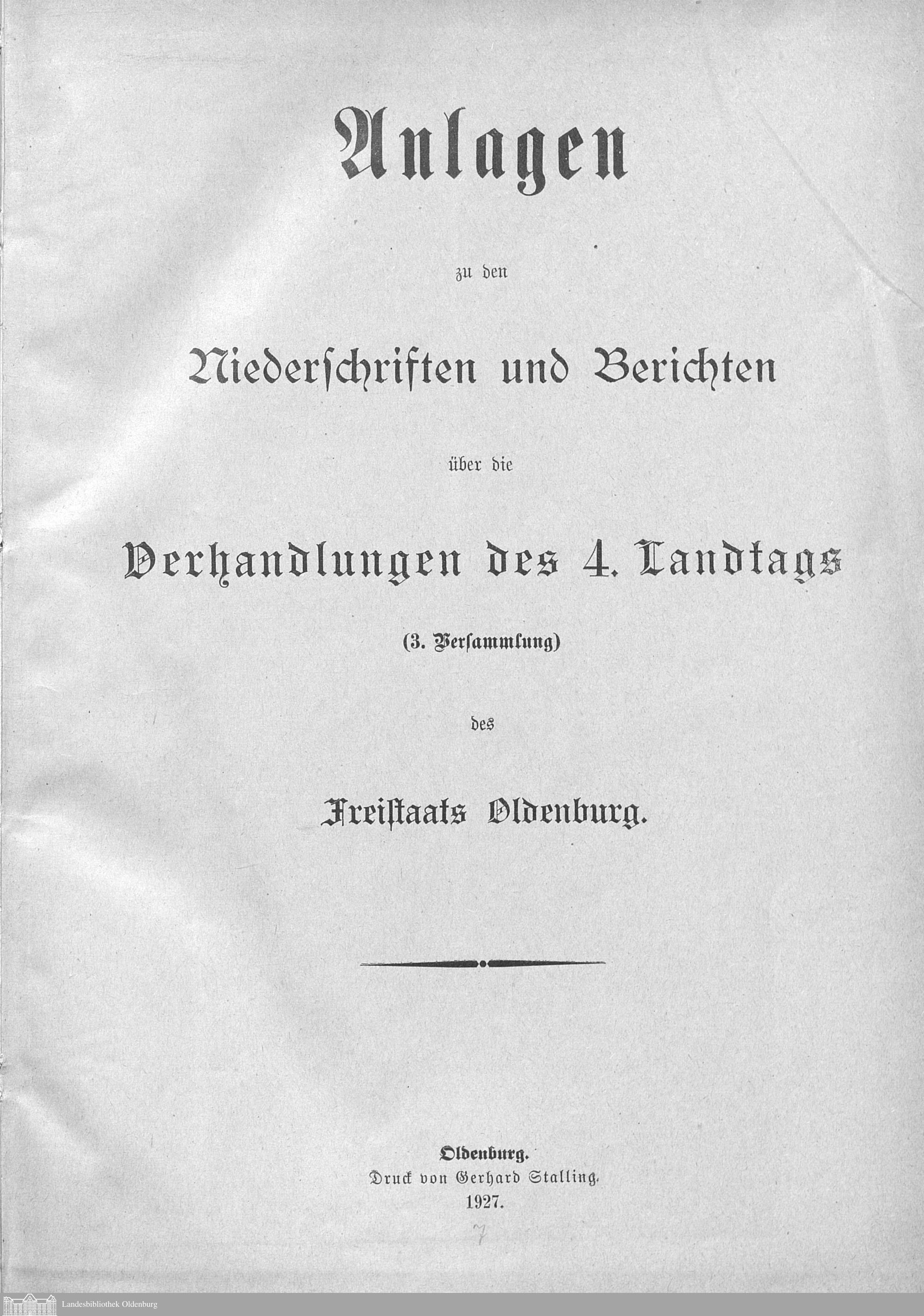Verhandlungen der ... Versammlung des ... Landtags des Freistaats Oldenburg / Anlagen zu den Niederschriften und Berichten / Anlagen zu den Protokollen und Berichten