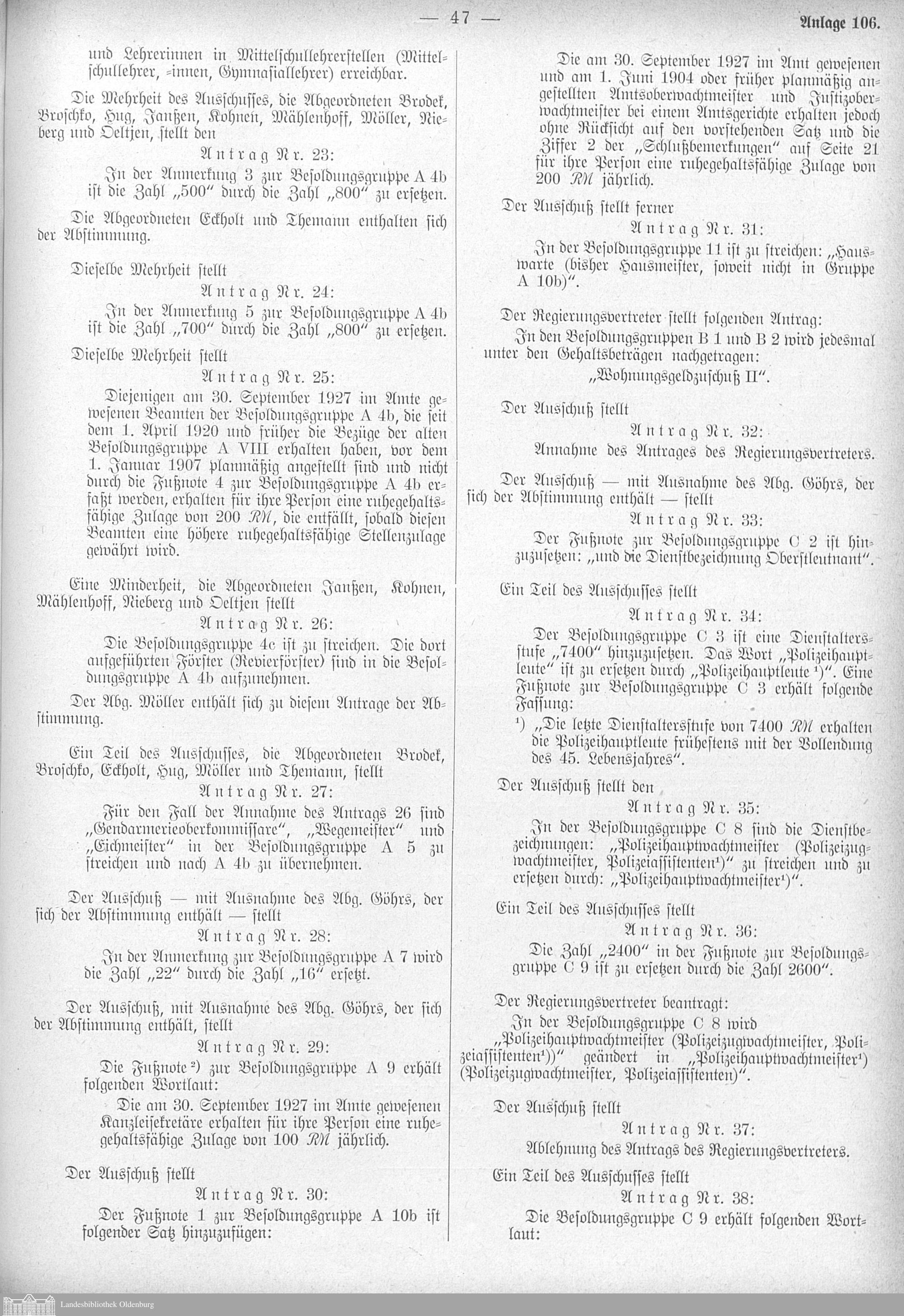 Verhandlungen der ... Versammlung des ... Landtags des Freistaats Oldenburg / Anlagen zu den Niederschriften und Berichten / Anlagen zu den Protokollen und Berichten