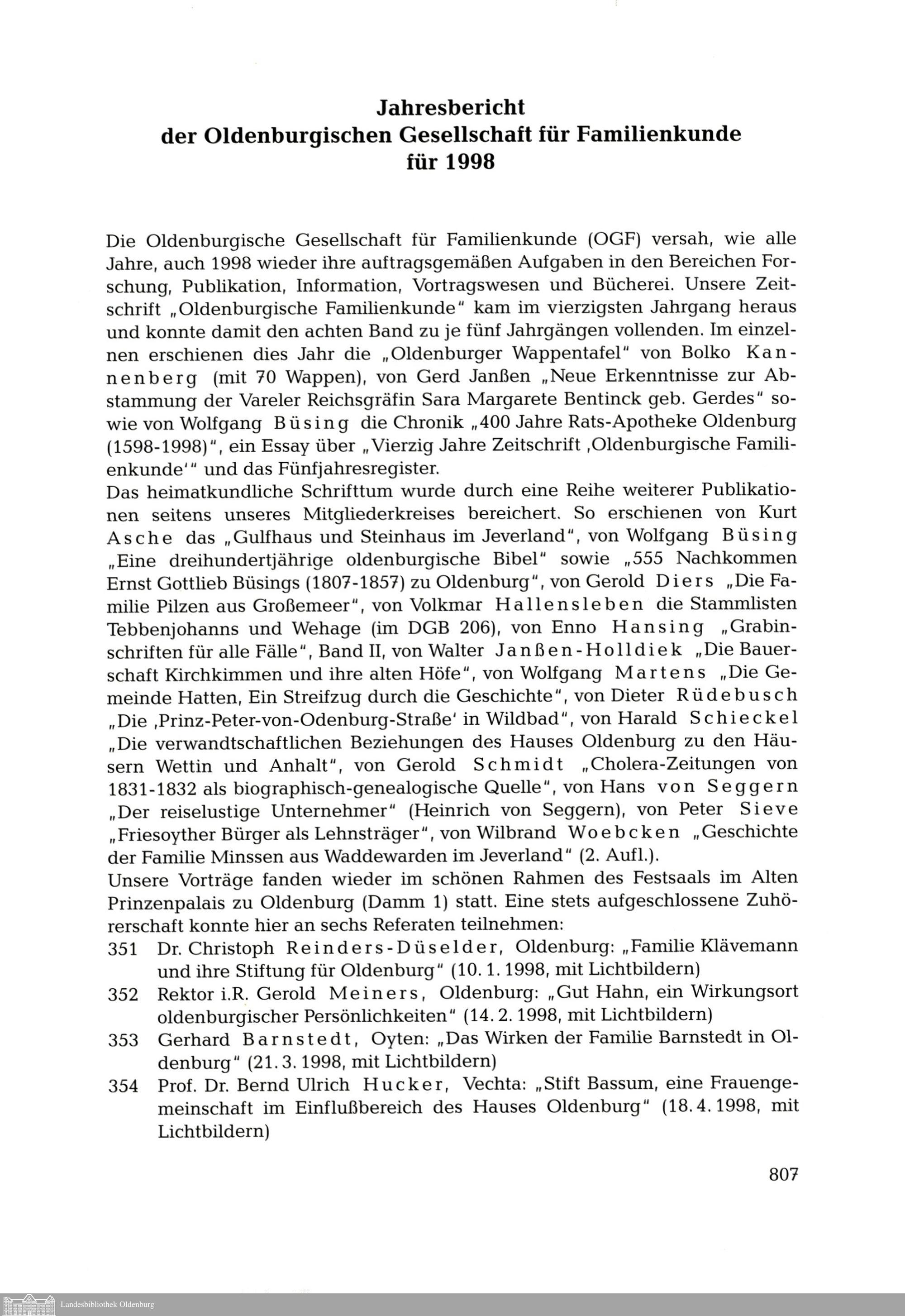 Jahresbericht der Oldenburgischen Gesellschaft für Familienkunde für 1998