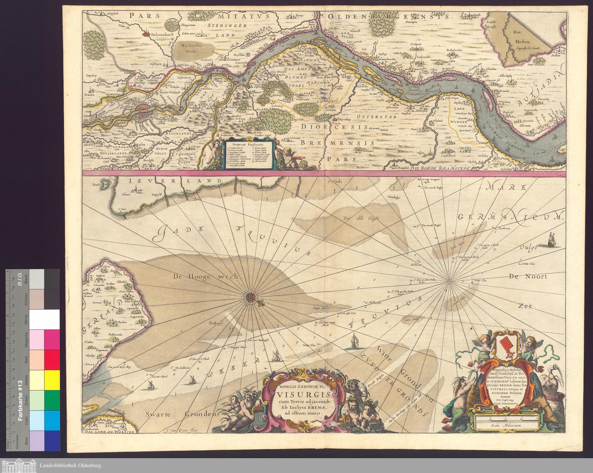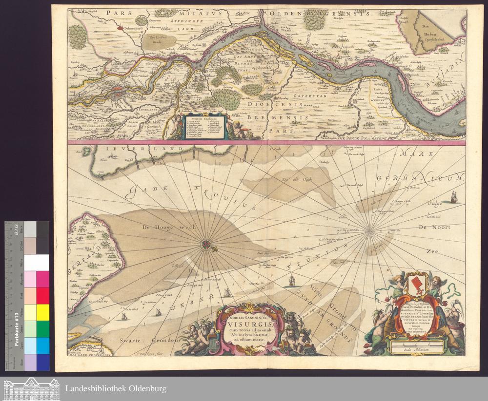 Nobilis Saxionæ Fl. Visurgis cum Terris adjacentib. : Ab Inclyta Brema ad ostium maris / Magnificis, Nobiliss, Clariss, Consultiss ac Prudentissimis Viris D.D. Coss. & Senatorib[us] Liberæ Imperialis Bremæ hanc fluv Visurgis, veram et accuratam Delineationem DD. Conferatq[ue] Ioan Ianssonius ; J. Van Loon fecit