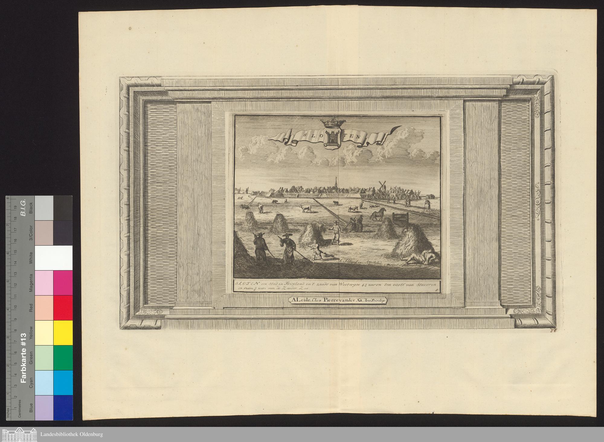 Sloten : een Stad in Friesland in't zuide[n] van Westergoo 4 1/4 uuren ten ooste[n] van Staveren en ruim 3/4 uurs van de Zuider Zee / Chez Pierre vander Aa ; I. Folkema Sculp.