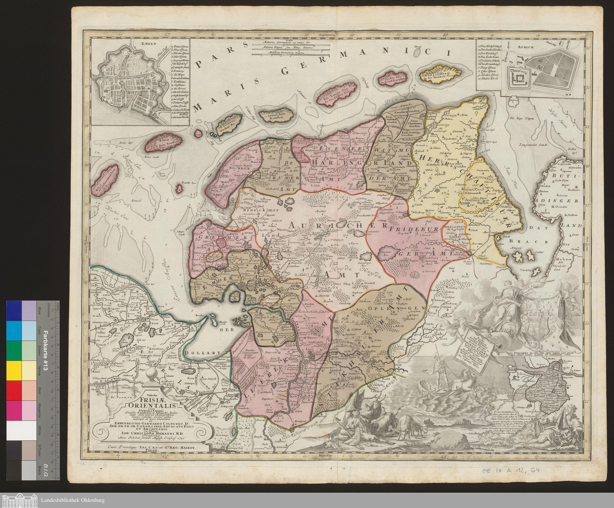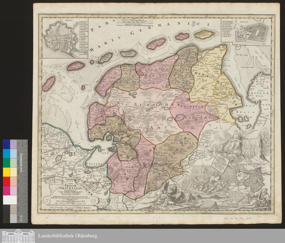 Tabula Frisiæ Orientalis / olim Vbbonis Emmii Deinde Sansonis et Allardi studio nota cum variis Autographis denuo collata, aucta, innumerisque in locis emendata ab Ehrenreichio Gerhardo Coldewey. D. Ser: Pr: Fr: Or: Consiliario Advocato Fisci Et Archivario