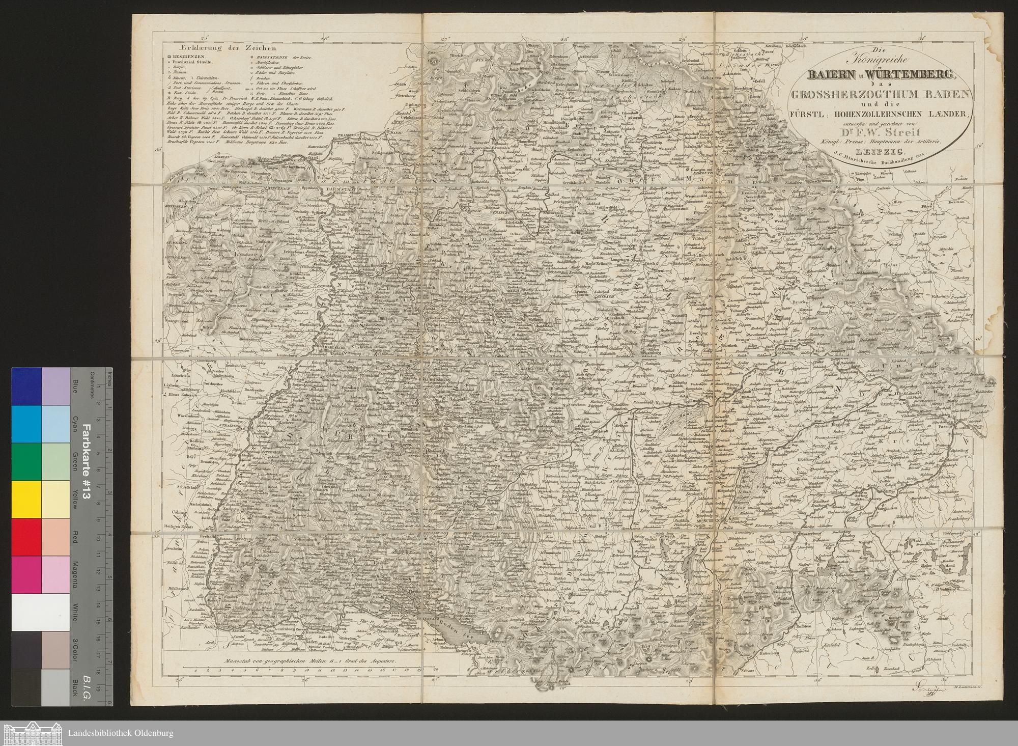 Die Königreiche Baiern u. Würtemberg, das Grossherzogthum Baden und die Fürstl. Hohenzollernschen Laender / entworfen und gezeichnet von Dr. F. W. Streit. Königl. Preuss. Hauptmann der Artillerie. H. Leutemann sc.