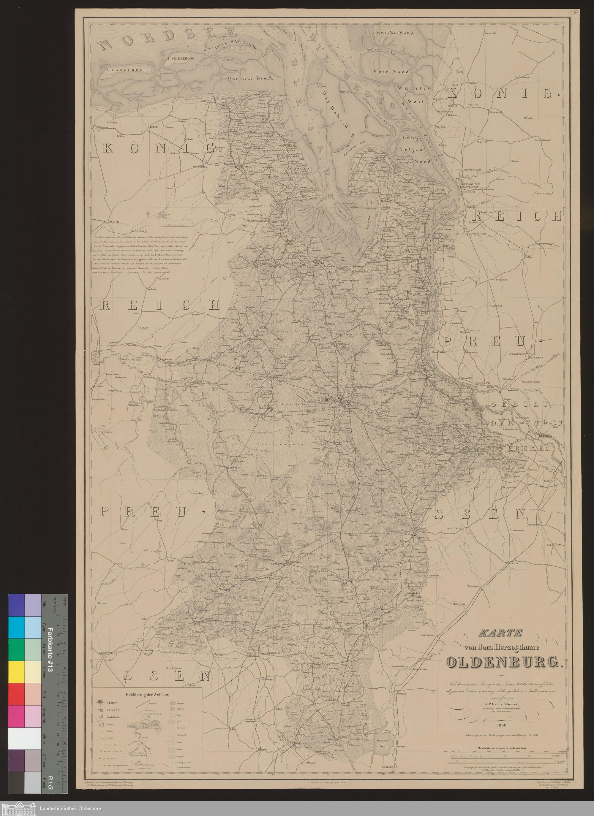 Karte von dem Herzogthume Oldenburg : nach der unter seiner Leitung in den Jahren 1835 bis 1850 ausgeführten allgemeinen Landesvermessung und den geschehenen Nachtragmessungen / entworfen von A.P. Freih. v. Schrenck, Grossherzogl. Oldenb. Vermessungs-Director und Ober-Cammeraath ; gezeichnet vom Vermessungs-Conducteur F. Hennings, die Nachtragungen von H. Francke und Schwarting ; gestochen von F.W. Kliewer, die Nachtragungen von P. Bang und W. Greve