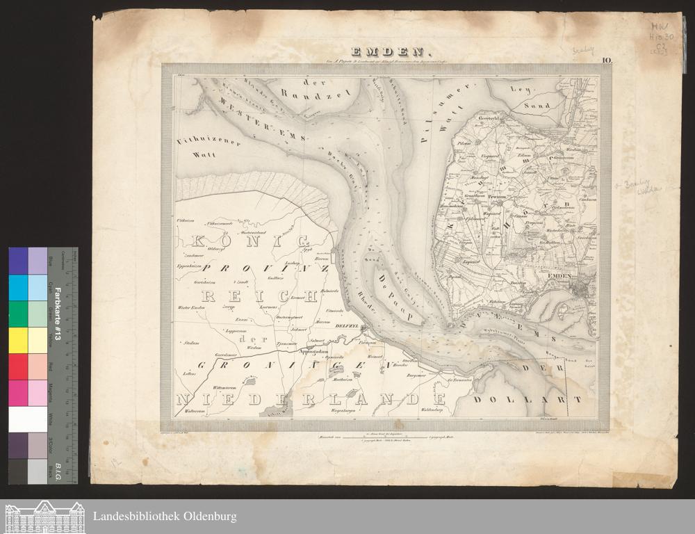10 (1840) Emden / Von A. Papen. Aufgetragen u. radirt v. H. Wolff. Situation u. Deiche gest. v. Wild jr. Wasser v. Carl Jättnig. Schrift v. Wilh. Brose