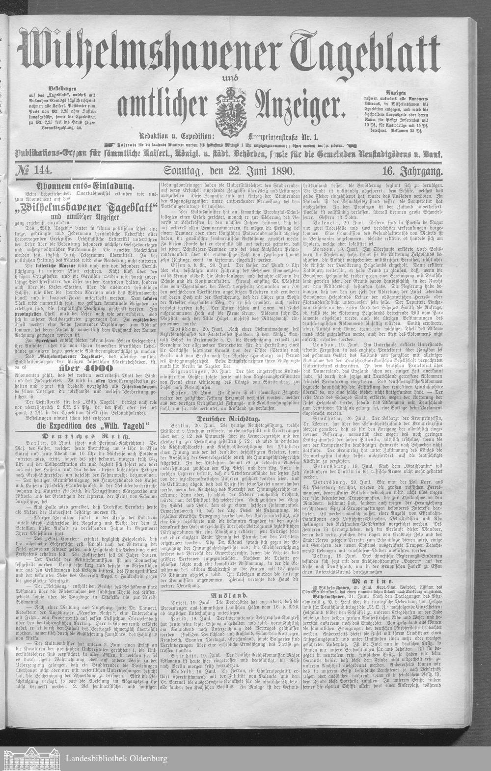 Wilhelmshavener Tageblatt und amtlicher Anzeiger. 1881-1909