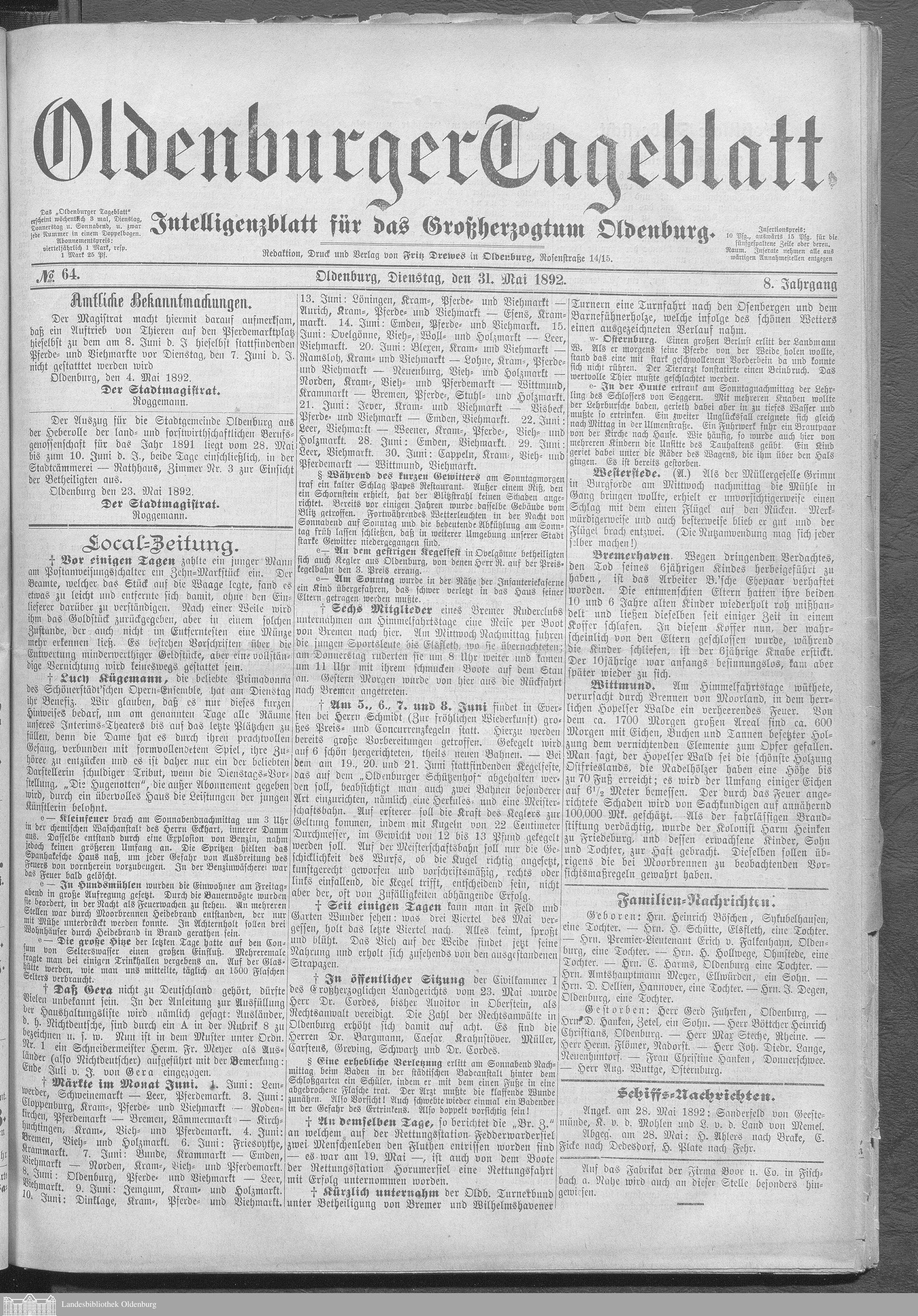 Oldenburger Tageblatt. 1891-1892