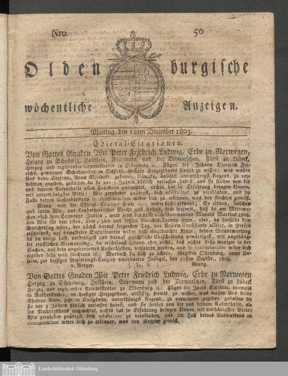 Oldenburgische wöchentliche Anzeigen. 1749-1826