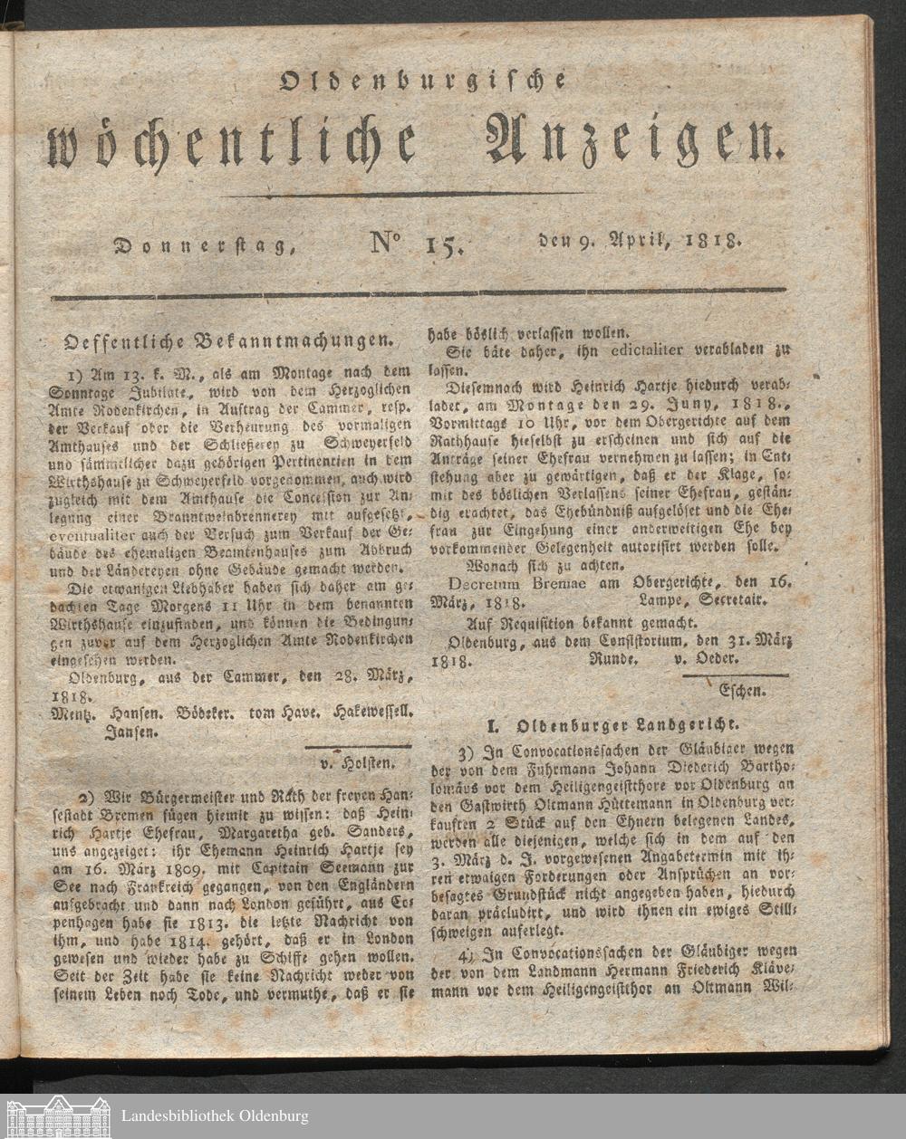 Oldenburgische wöchentliche Anzeigen. 1749-1826
