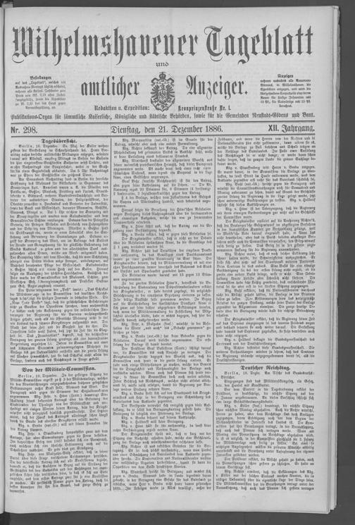 Wilhelmshavener Tageblatt und amtlicher Anzeiger : amtliches Organ für die kaiserl., königl. und städtischen Behörden, für die Gemeinden Bant, Heppens und Neuende, sowie die Ämter und Amtsgerichte Jever und Rüstringen