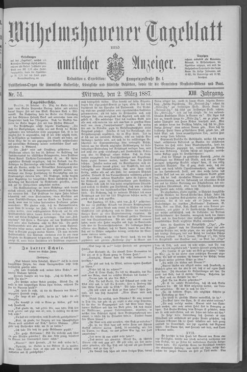 Wilhelmshavener Tageblatt und amtlicher Anzeiger : amtliches Organ für die kaiserl., königl. und städtischen Behörden, für die Gemeinden Bant, Heppens und Neuende, sowie die Ämter und Amtsgerichte Jever und Rüstringen