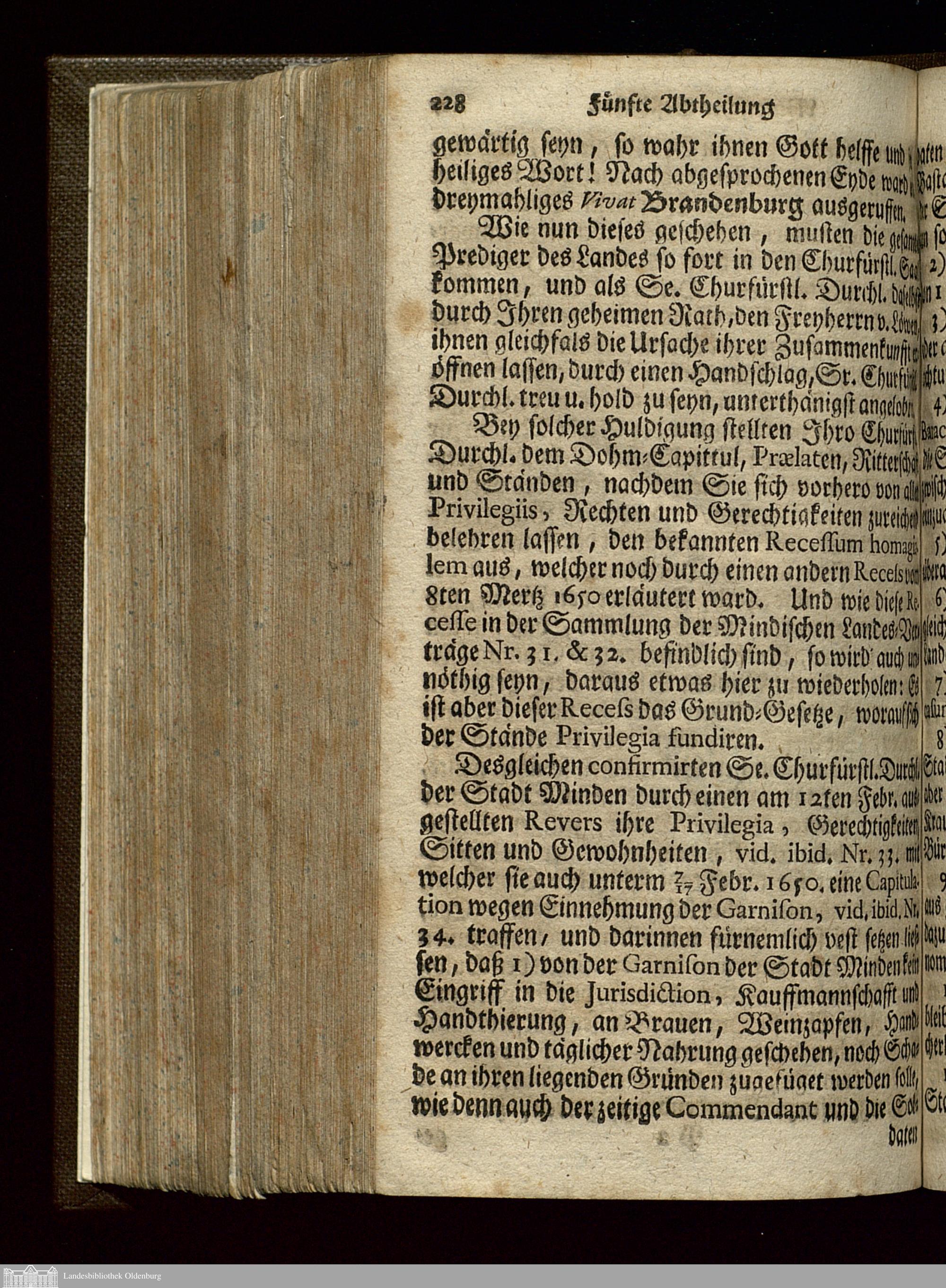 Abtheilung 5 (1748) Darinnen kürtzlich erzehlet wird, Was sich Unter der Regierung sechs Bischöffe und des Chur-Hauses Brandenburg, Vom Jahr 1554. bis 1713. Im Stifft Minden merckwürdiges zugetragen; Aus beglaubten Nachrichten zusammen gebracht : Nebst Dreyen zur Mindischen Historie dienenden Monumentis / H.A. Meinders, quondam ICti Ravensbergensis