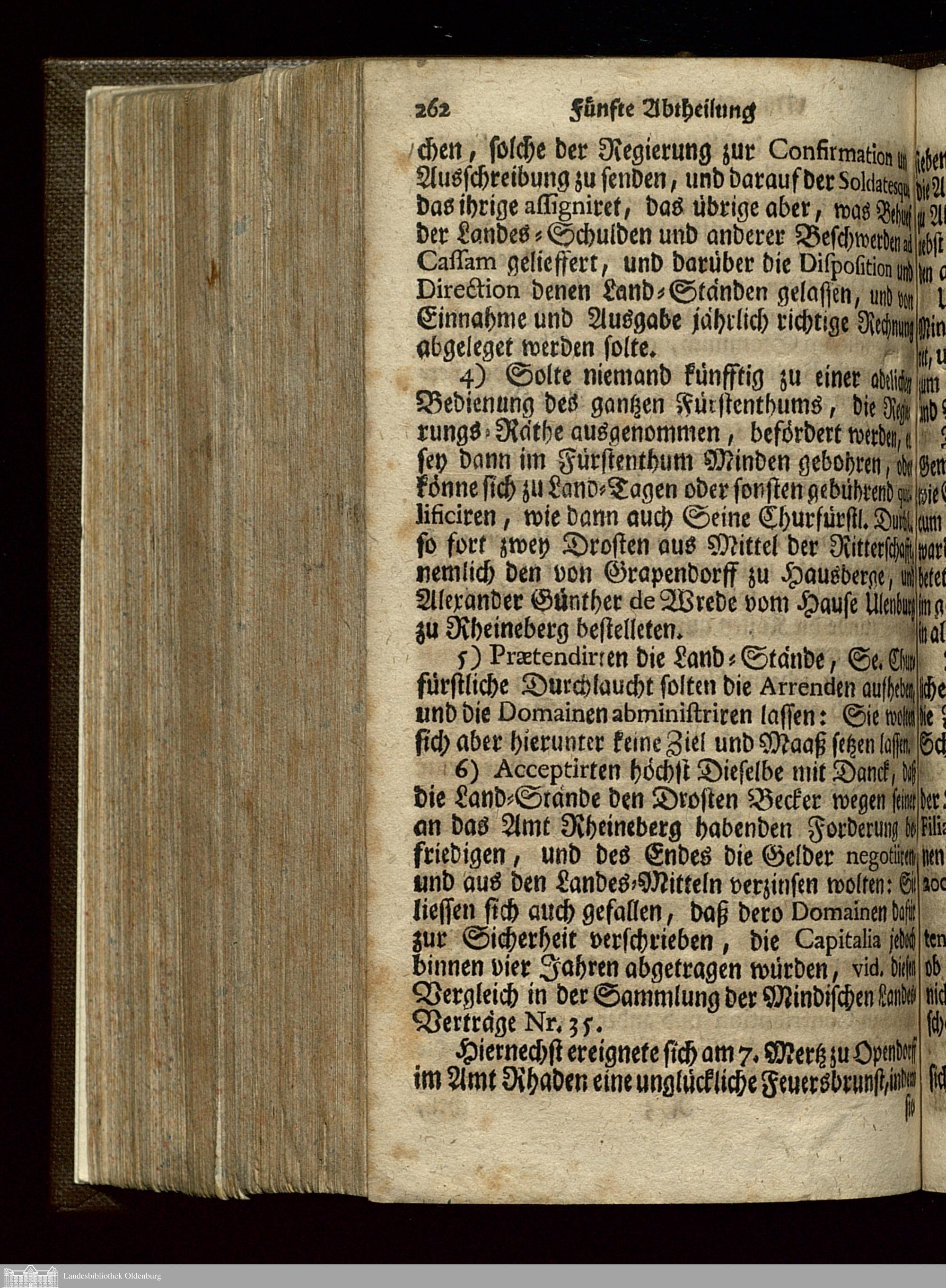 Abtheilung 5 (1748) Darinnen kürtzlich erzehlet wird, Was sich Unter der Regierung sechs Bischöffe und des Chur-Hauses Brandenburg, Vom Jahr 1554. bis 1713. Im Stifft Minden merckwürdiges zugetragen; Aus beglaubten Nachrichten zusammen gebracht : Nebst Dreyen zur Mindischen Historie dienenden Monumentis / H.A. Meinders, quondam ICti Ravensbergensis