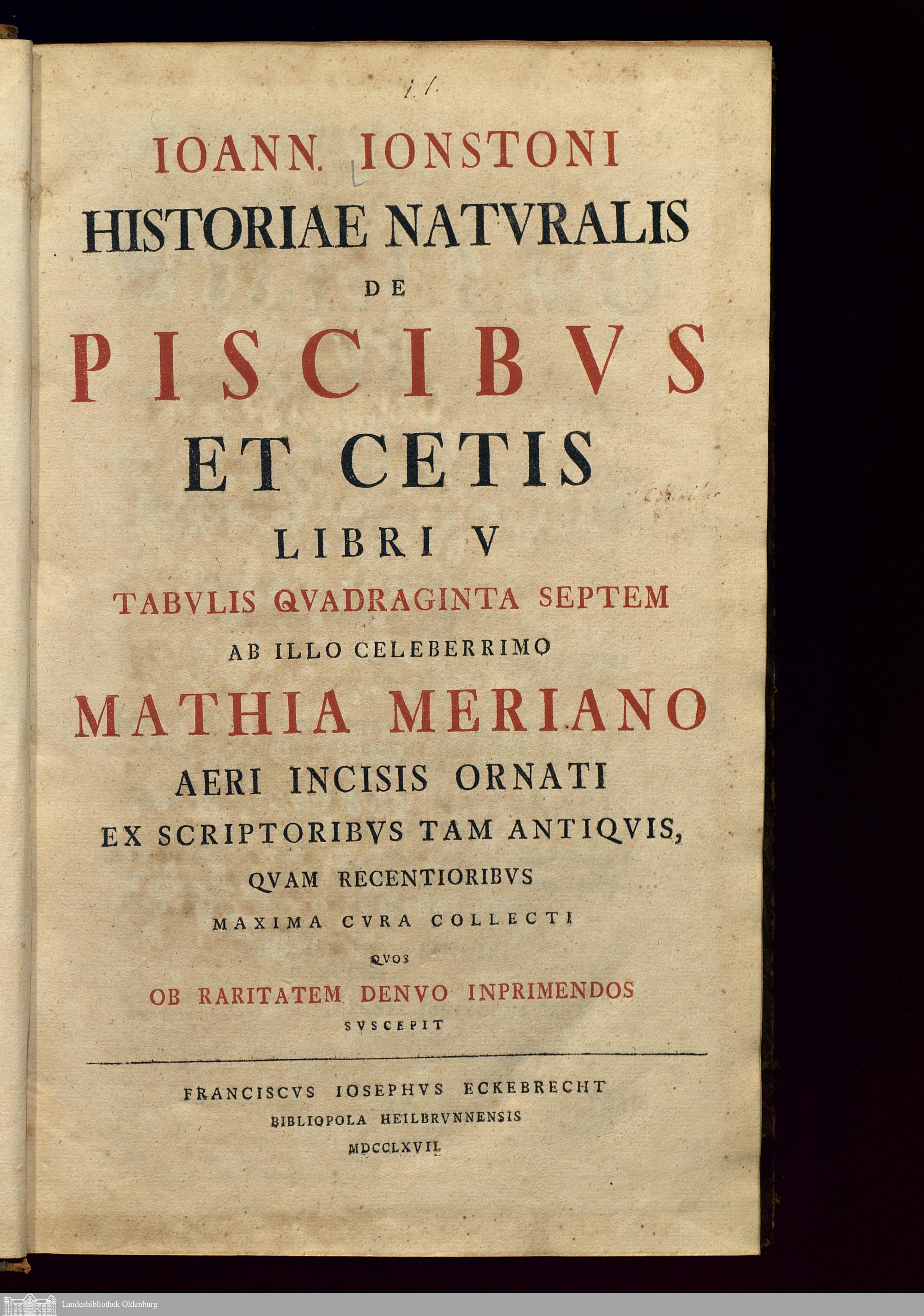 Tomus 3,1 (1767) Ioann. Ionstoni|| Historiae Natvralis|| De|| Piscibvs|| Et Cetis|| Libri V|| / Tabvlis Qvadraginta Septem|| Ab Illo Celeberrimo|| Mathia Meriano|| Aeri Incisis Ornati|| Ex Scriptoribvs Tam Antiqvis,|| Qvam Recentioribvs|| Maxima Cvra Collecti|| Qvos|| Ob Raritatem ...
