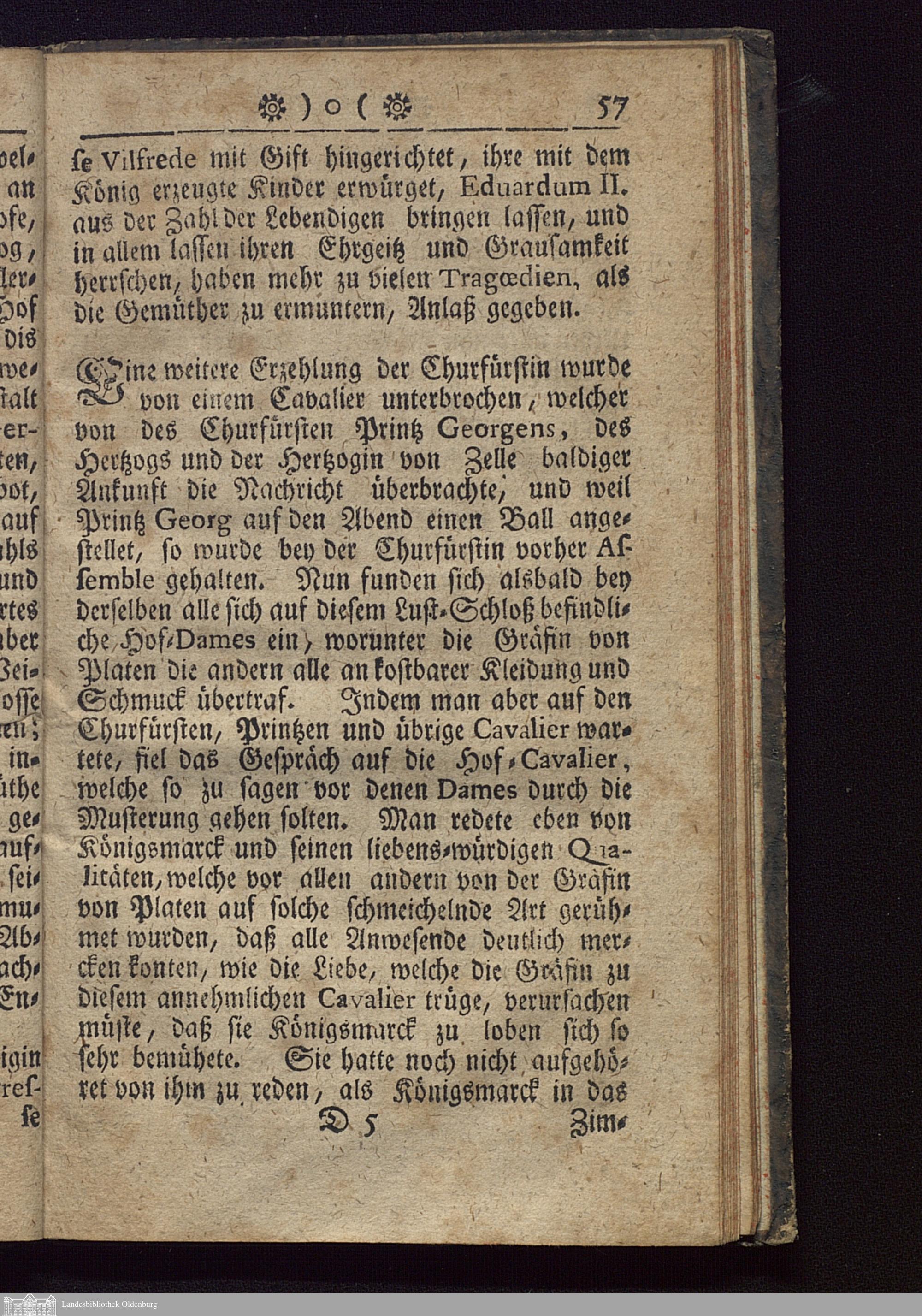 Lebens-Beschreibung Der Hertzogin von Hannover : Worinnen dieser Prinzeßin wunderbares Schicksal in der auf dem Schlosse Ahlen bis an Ihr Ende verharrenden Einsamkeit mit beygefügten Fatalitaeten des verunglückten Grafen Königsmarck enthalten / Aus dem Französischen ins Teutsche übersetzt