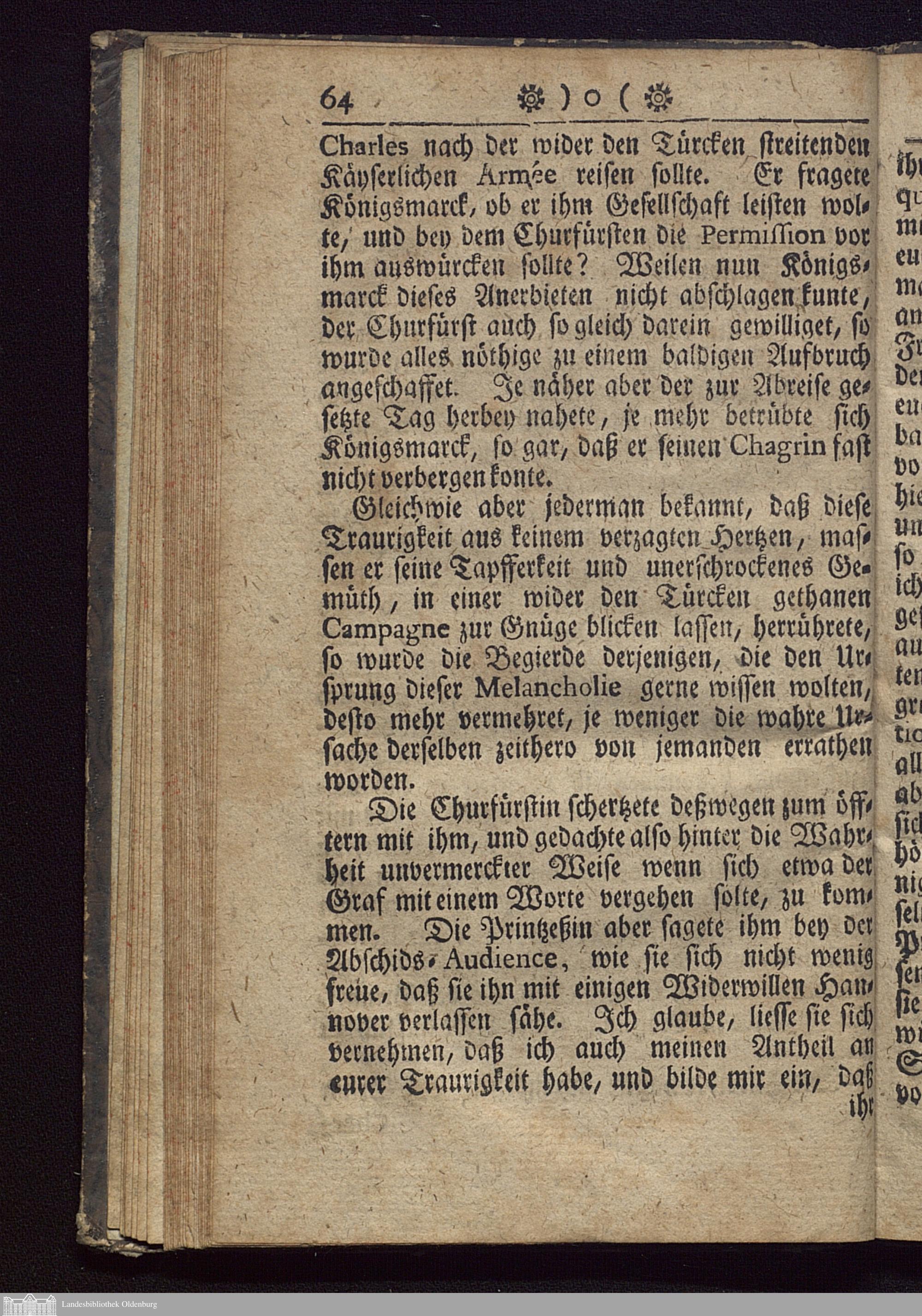 Lebens-Beschreibung Der Hertzogin von Hannover : Worinnen dieser Prinzeßin wunderbares Schicksal in der auf dem Schlosse Ahlen bis an Ihr Ende verharrenden Einsamkeit mit beygefügten Fatalitaeten des verunglückten Grafen Königsmarck enthalten / Aus dem Französischen ins Teutsche übersetzt