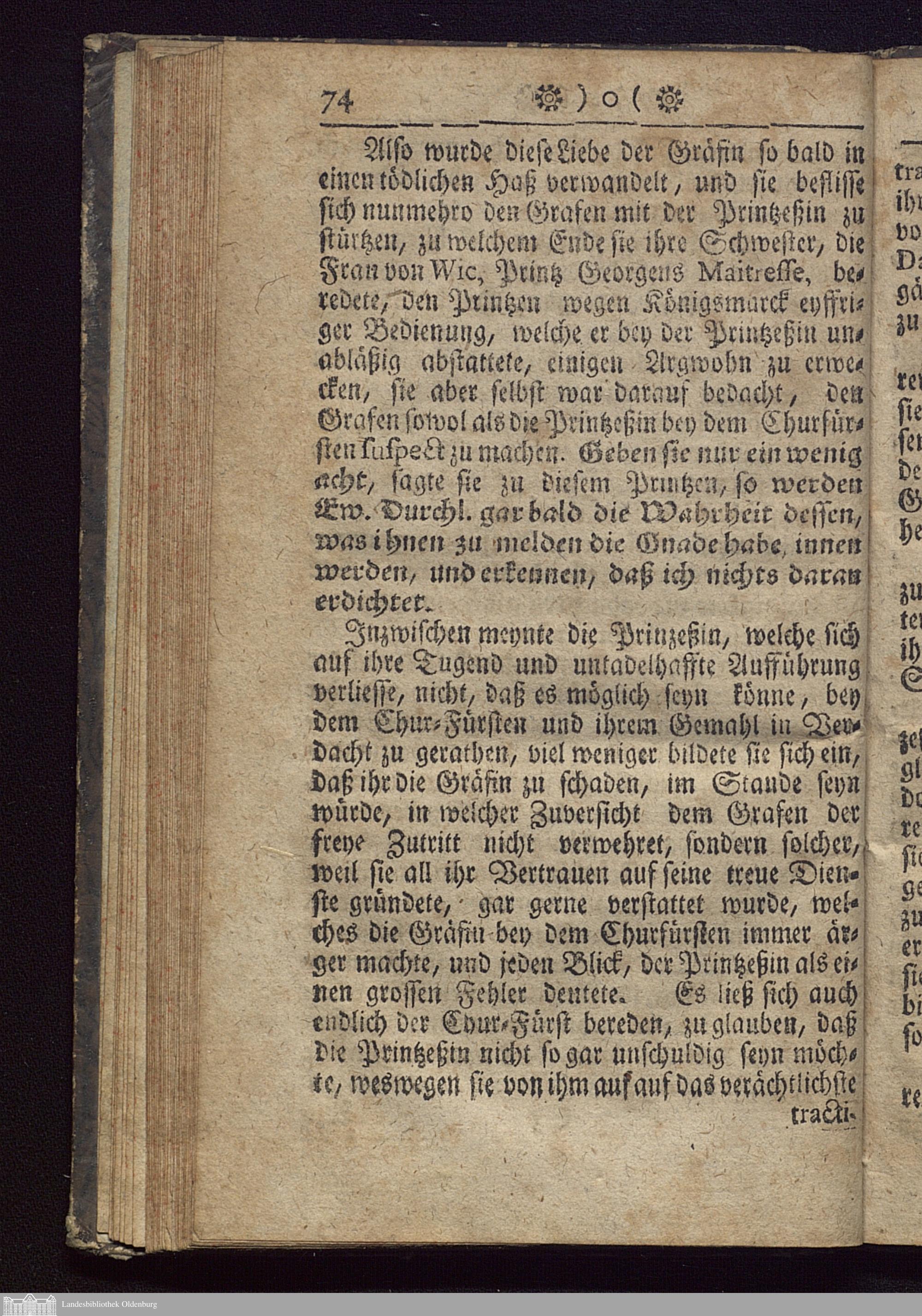 Lebens-Beschreibung Der Hertzogin von Hannover : Worinnen dieser Prinzeßin wunderbares Schicksal in der auf dem Schlosse Ahlen bis an Ihr Ende verharrenden Einsamkeit mit beygefügten Fatalitaeten des verunglückten Grafen Königsmarck enthalten / Aus dem Französischen ins Teutsche übersetzt