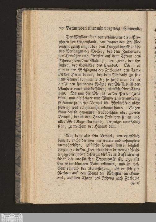 Zweyter Abschnitt. Zubereitung des Beweises durch genauere Uebersetzung, und Erläuterung der Stelle des Propheten, daß das Haus Haga. 2.7. (8) 10. nicht für den irdischen Tempel der Juden, nicht für das Haus v. 3 (4) kann angesehen werden.