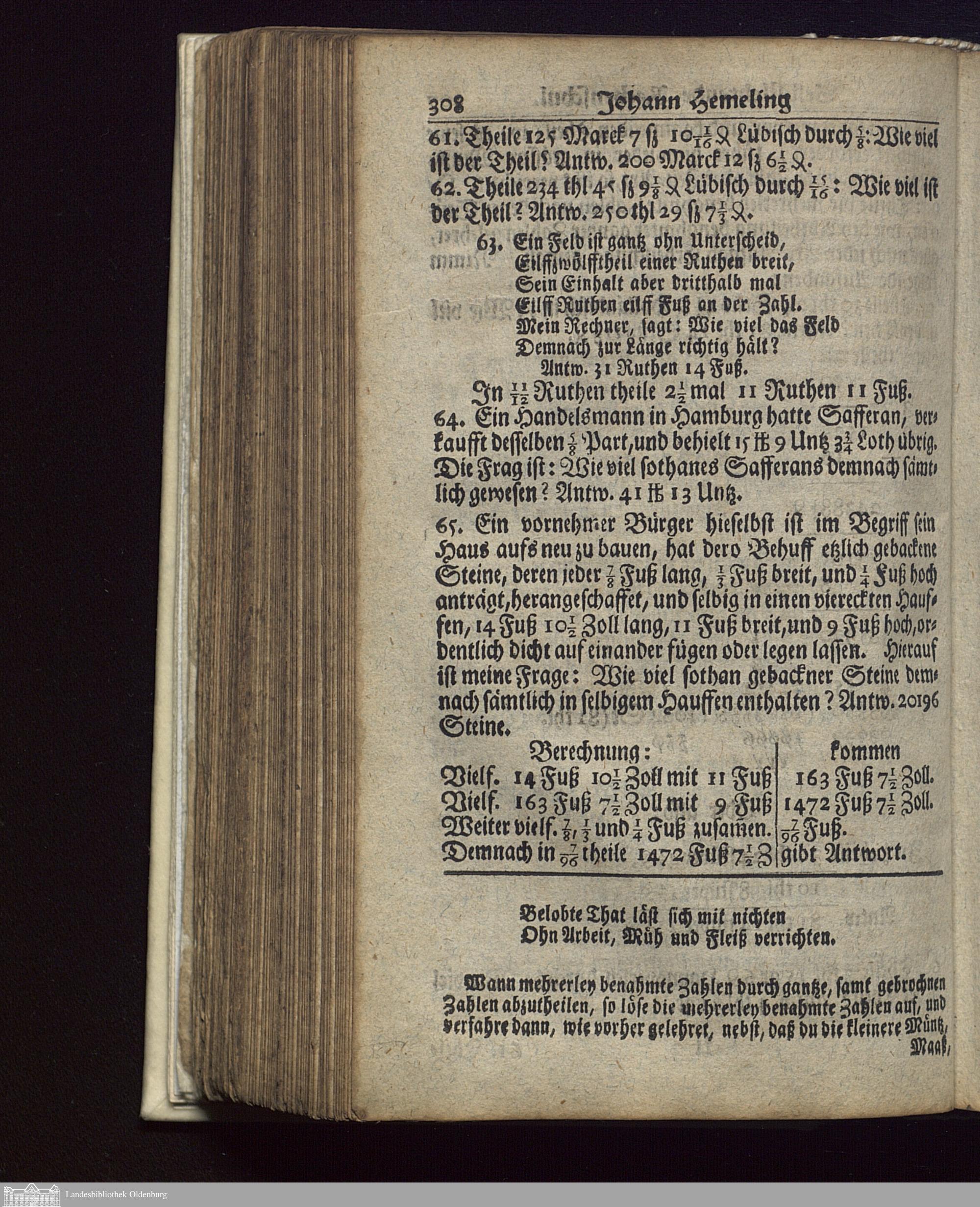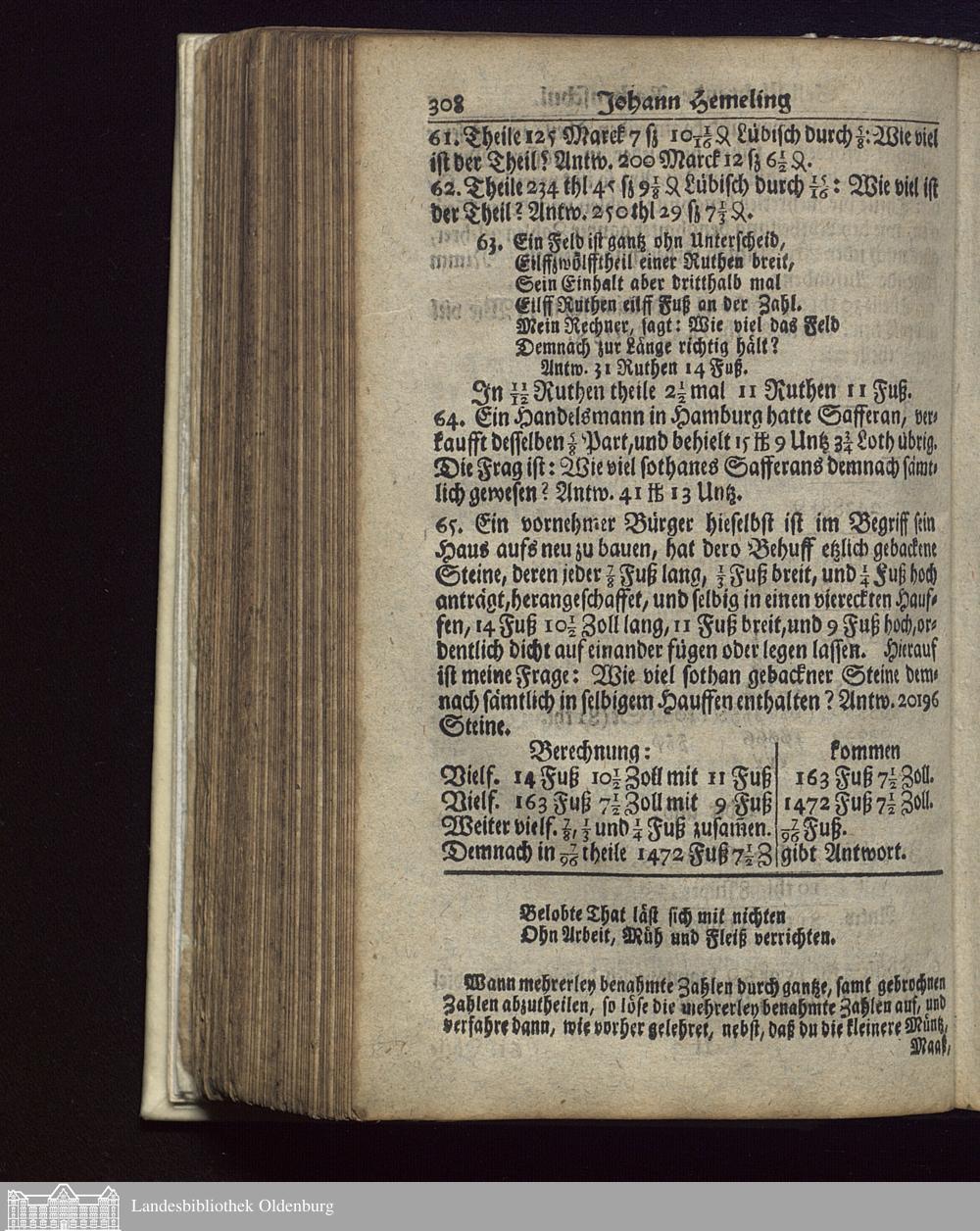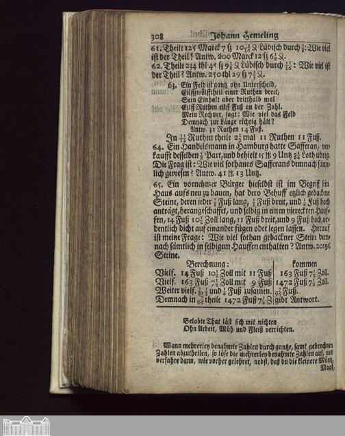 Neuvermehrter vollkommener Rechenmeister, Oder Selbstlehrendes Rechen-Buch : Das ist: Die edle Rechen-Kunst, beydes nach allgemein- und kurtzer Art, (welche etliche unter dem Namen Welsch- oder Italische Practica verstehen wollen) ...durch Johannem Hemelingium, Käyserlich gekrönten Poeten, und Schreib- und Renmeistern der Fürstl. Braunschweig. Lünebneburg. Residentz-Stadt Hannover